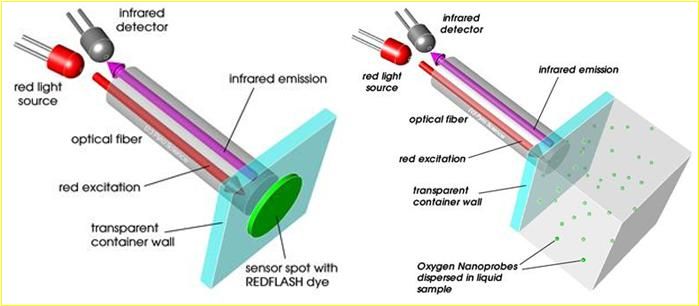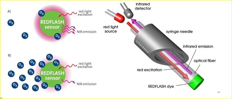 REDFLASH光极O2传感器技术,利用独特的O2敏感REDFLASH指示剂,通过610-630nm调制红光激发,REDFLASH指示剂发出760-790nm红外荧光,荧光强度随接触的O2分子浓度升高而发生荧光淬灭,这种荧光动态通过光纤传输到测量仪,测量仪灵敏地检测其相位漂移并据此换算成O2浓度