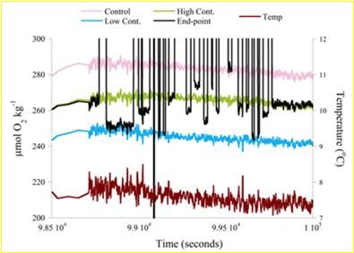 案例3:美国Woods Hole海洋学研究所,利用RF-O2非接触式光极氧气传感器(sensor spot),对海洋无脊椎动物呼吸代谢进行了测量分析,以研究其固有的生物钟与环境胁迫的关系,这些海洋无脊椎动物体重只有0.5-50mg。图中为翼足类软体动物在不同浓度CO2条件下的耗氧率。